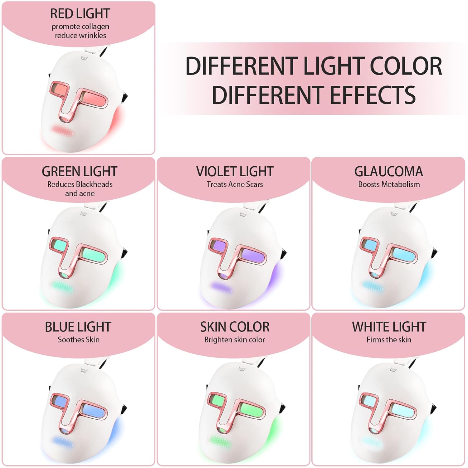 - Advanced 7-Color LED Light Therapy: Reveal your most radiant skin with the LED Facial Mask, featuring 7 therapeutic light colors designed to target multiple skin concerns. Each wavelength delivers unique benefits — from red light that promotes collagen and reduces wrinkles, to blue light that soothes irritation and fights acne. Green helps control oil and fade dark spots, purple reduces acne scars, orange brightens the skin, cyan improves circulation and metabolism, and white enhances skin firmness for a youthful glow.